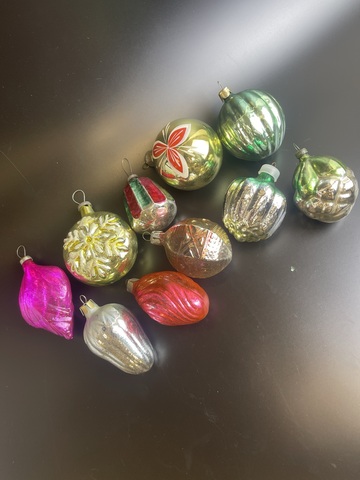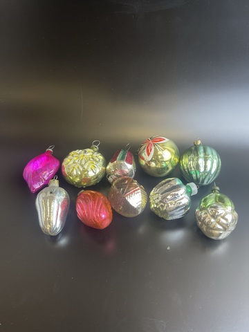Ёлочные игрушки набор из 10 разных штук, шарики, колокольчик и др, стекло, винтаж СССР 1950-1980 гг. Комплектация и состояние на фото
