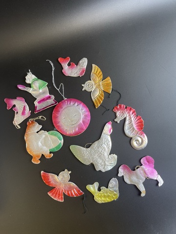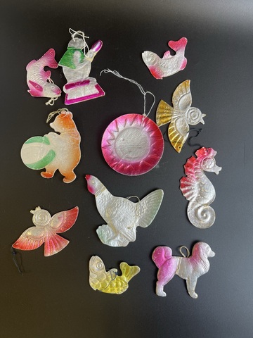 Ёлочные игрушки набор из 11 картонажных игрушек, рыбки, птички, медведи, морской конёк, солнце, собачка, есть дефекты, винтаж, СССР 1940-1960 гг. Присутствуют следы использования - комплектация и состояние на фото
