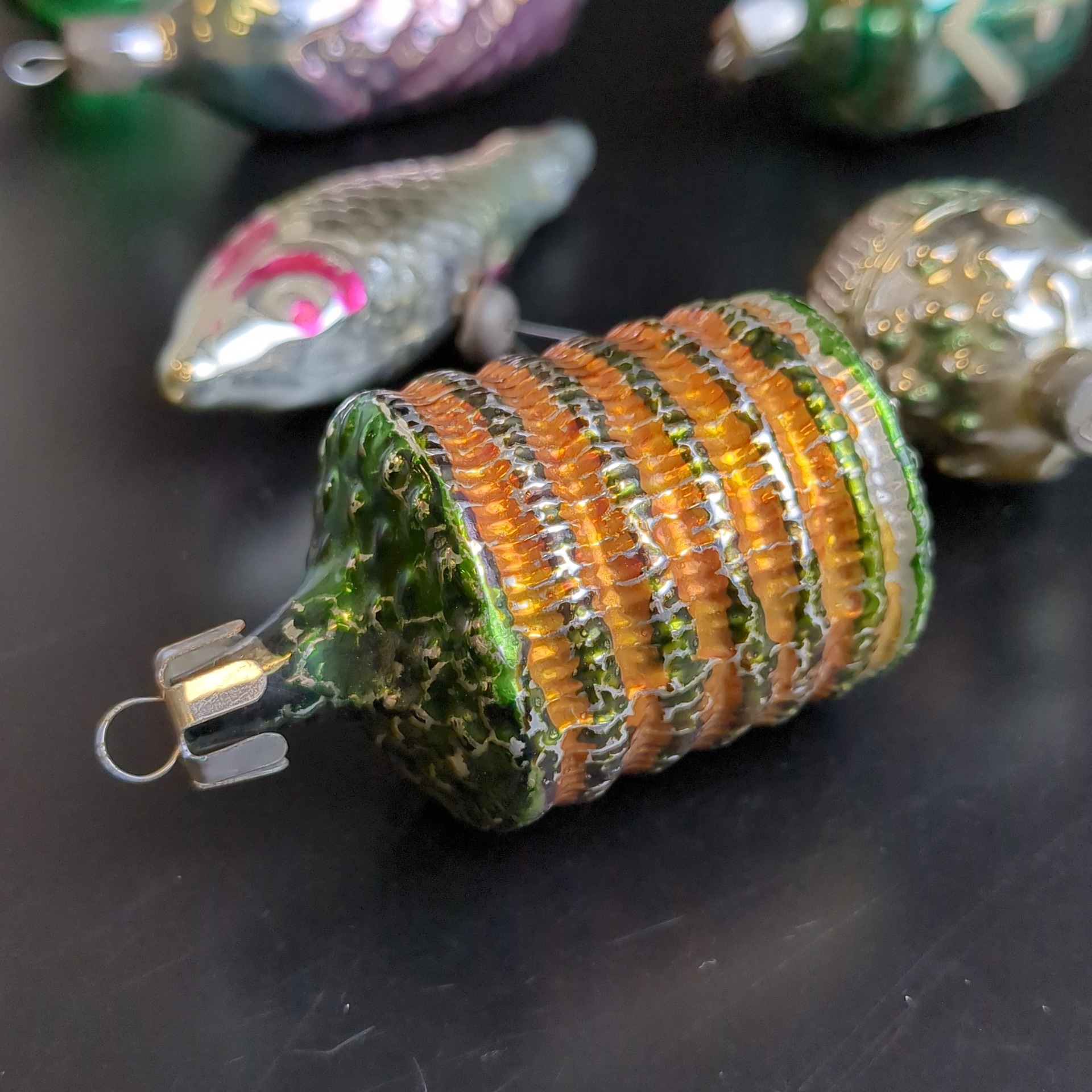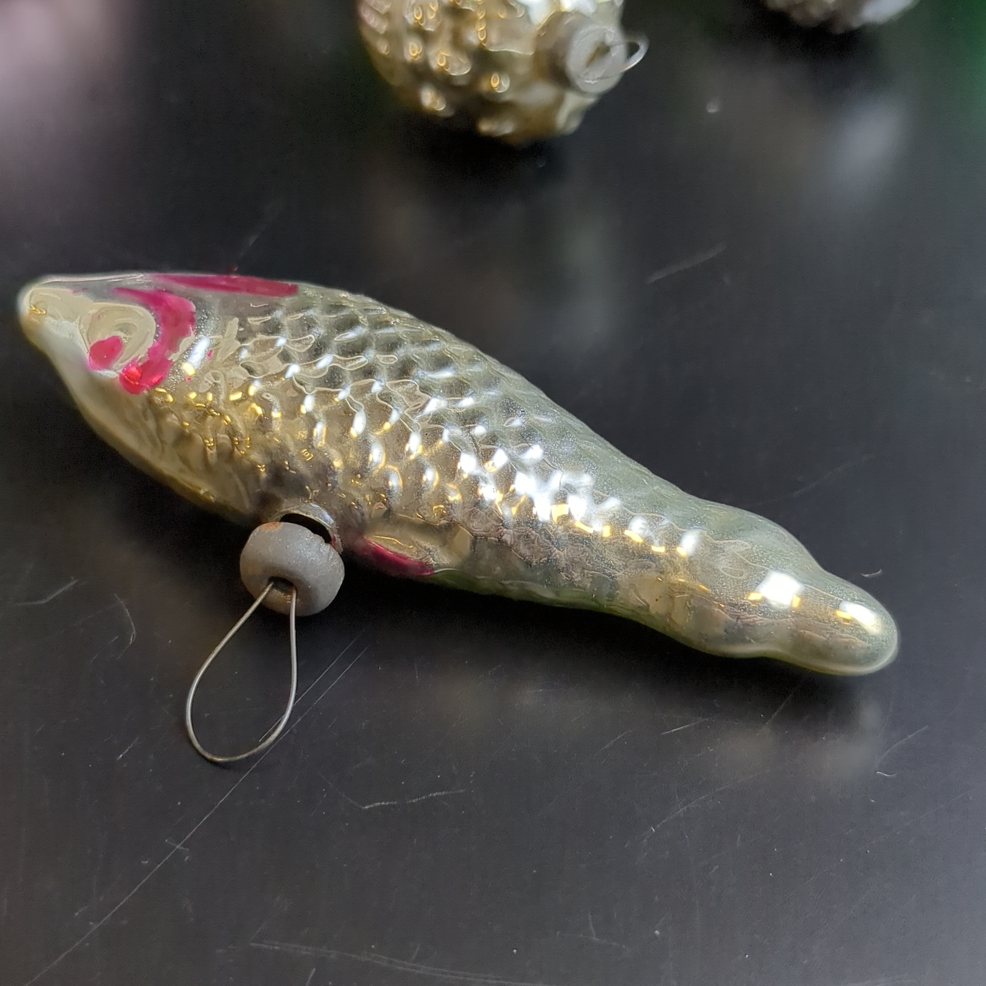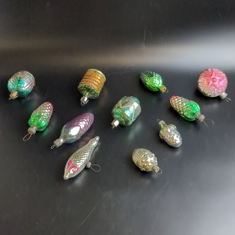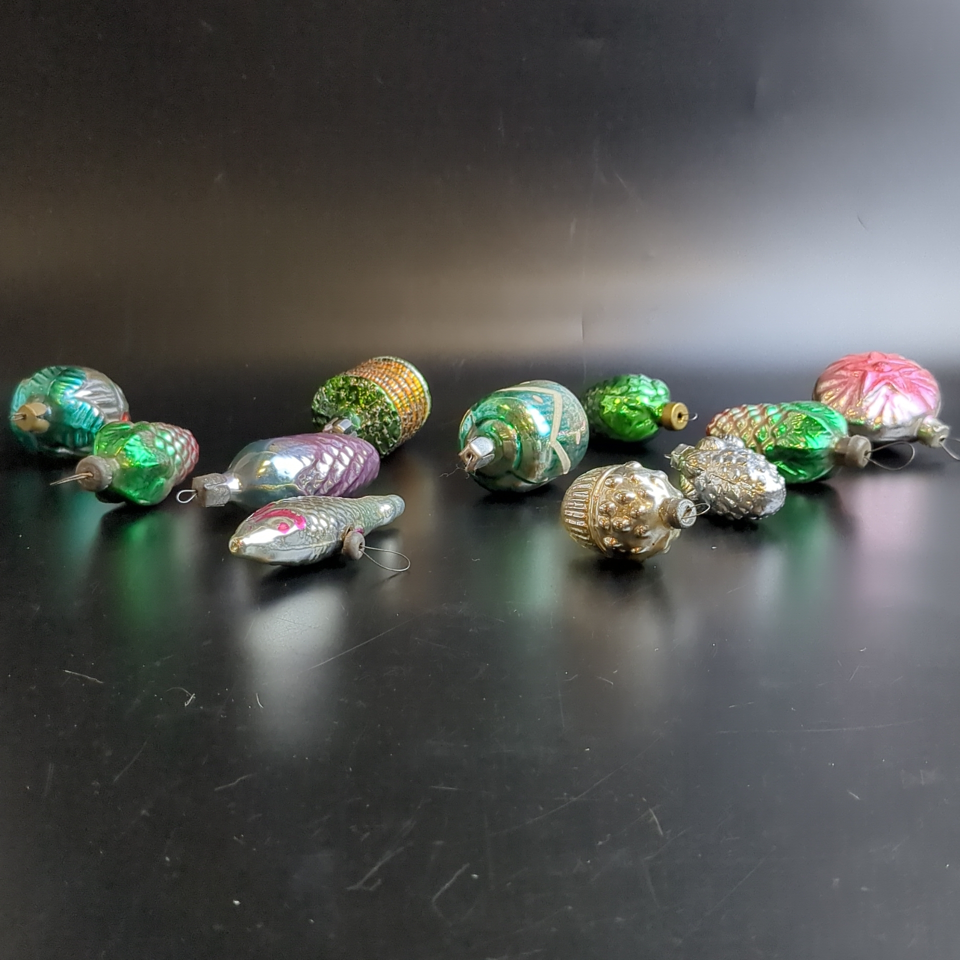 Ёлочные игрушки набор из 11 разных небольших штук, рыбка, медальон, шишки и др, стекло, подвесные, винтаж времён СССР 1960-1980 гг. Советские ёлочные игрушки и украшения. Состояние и комплектация на фото, могут присутствовать незначительные неровности и сколы, закрытые металлическим подвесом (под подвесом).