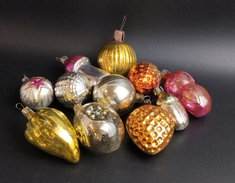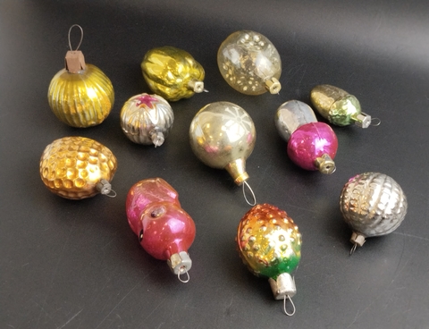 Ёлочные игрушки набор из 11 разных небольших, стекло, роспись, узоры, подвесные, винтаж СССР 1960-1990 гг