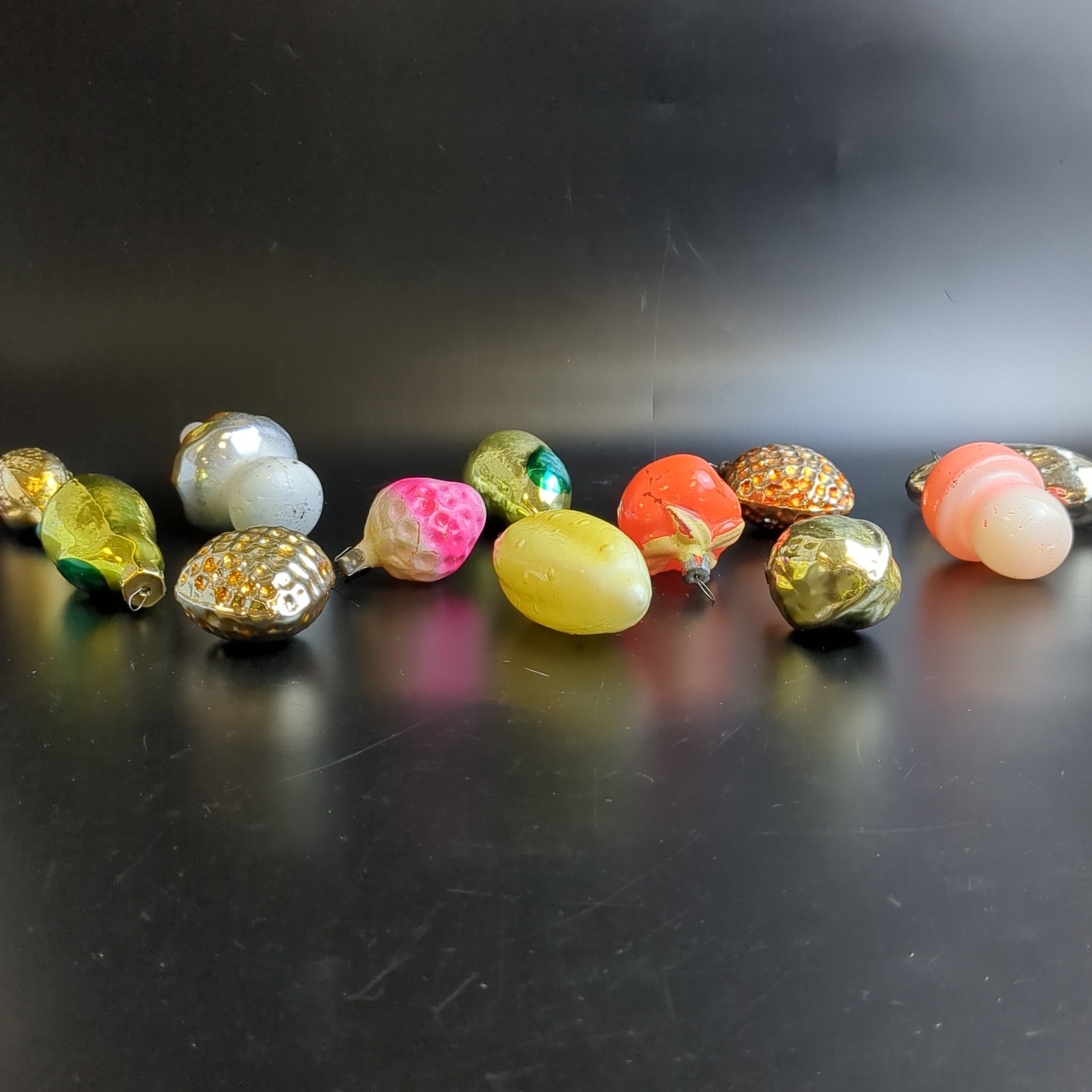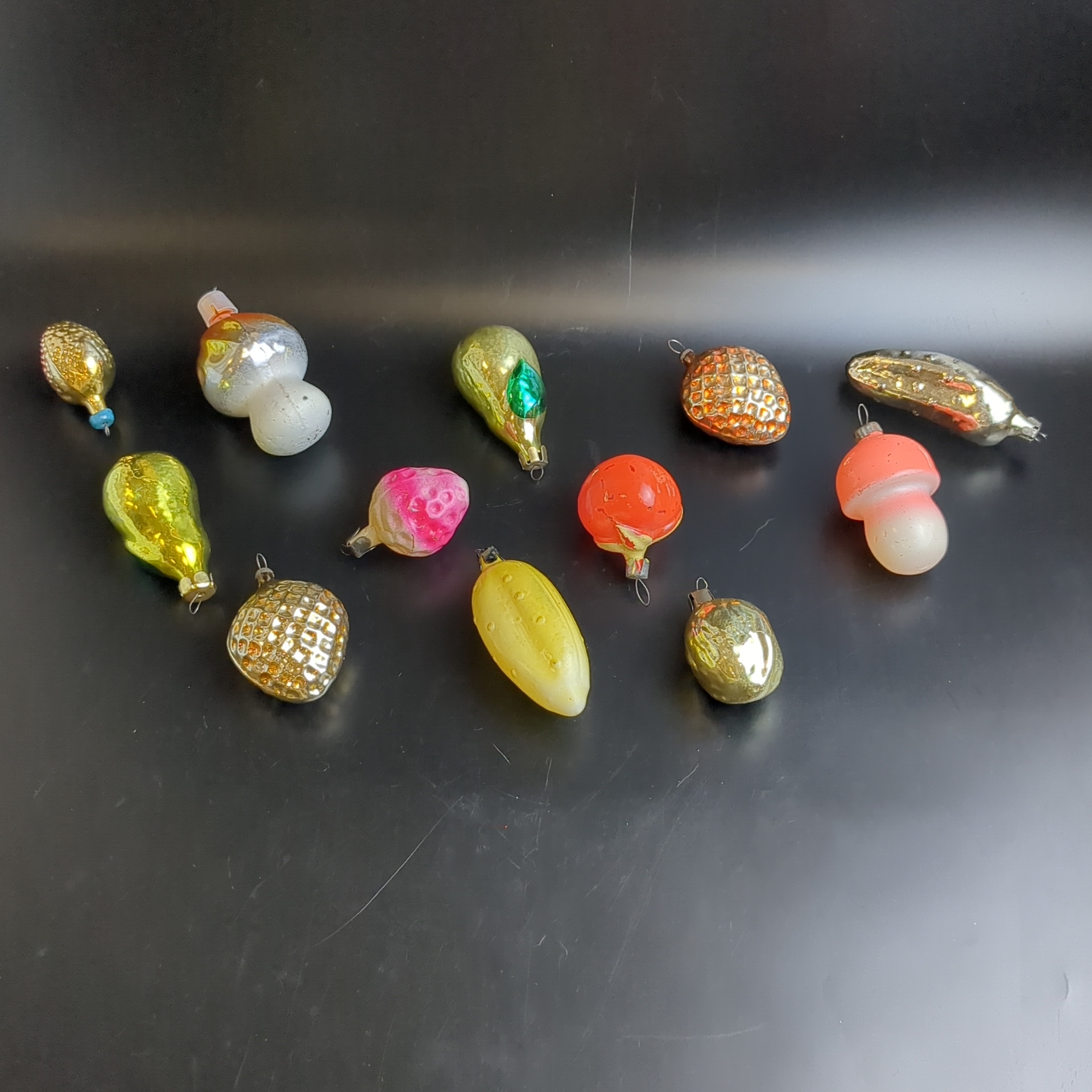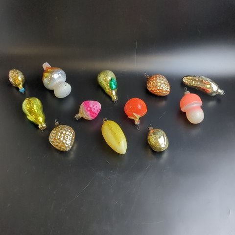 Ёлочные игрушки набор из 12 разных штук фрукты и овощи, гриб, клубнички, груша и др, стекло, подвесные, винтаж времён СССР 1960-1990 гг. Советские ёлочные игрушки и украшения. Состояние и комплектация на фото.