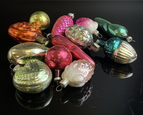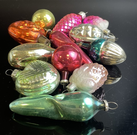 Ёлочные игрушки набор из 12 штук разные, ягодки, шарики, сердечко и др, стекло, подвесные, яркие, роспись, винтаж СССР 1960-1980 гг