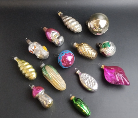 Ёлочные игрушки набор из 13 разных небольших, стекло, роспись, узоры, подвесные, винтаж СССР 1960-1990 гг