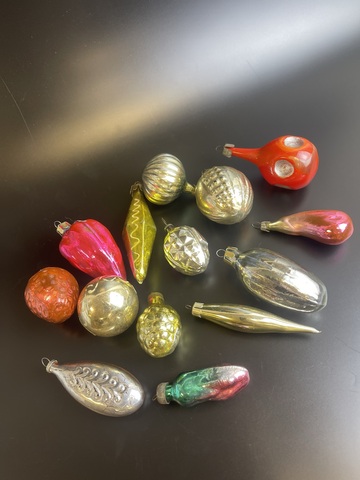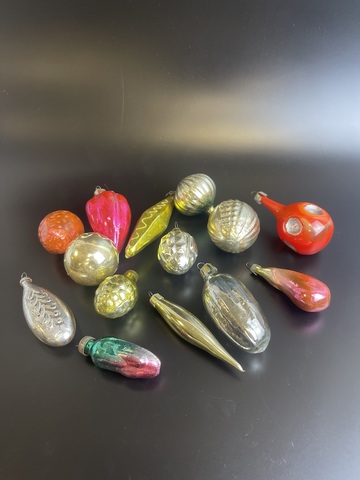 Ёлочные игрушки набор из 14 разных штук, клубничка, перчик, баклажан, фонарик и др, винтаж, стекло, СССР 1950-1980 гг. Комплектация и состояние на фото