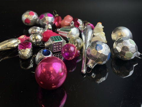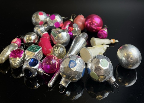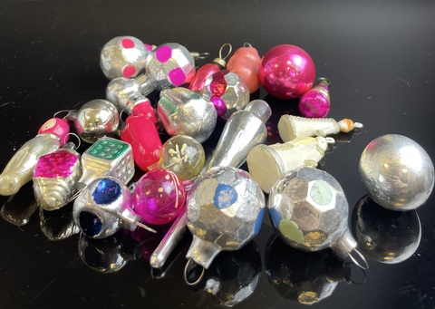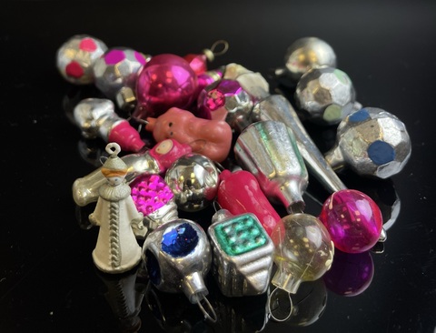 Ёлочные игрушки набор из 24 малюток, Дед Мороз и Снегурочка, космонавт, снеговик, пирамидка, пика и др, стекло, подвесные, винтаж СССР 1960-1980 гг