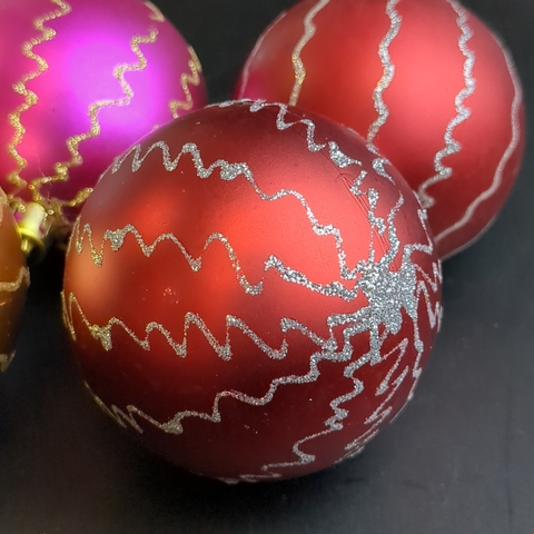 Ёлочные игрушки набор из 4 пластмассовых ярких с узорами шаров, подвесные, в стиле винтаж. Состояние и комплектация на фото.