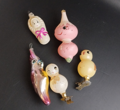 Ёлочные игрушки набор из 5 разных Чипполино, попугай, лялечка, цыпленок и заяц на прищепках, стекло, роспись, узоры, винтаж СССР 1960-1990 гг