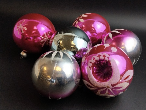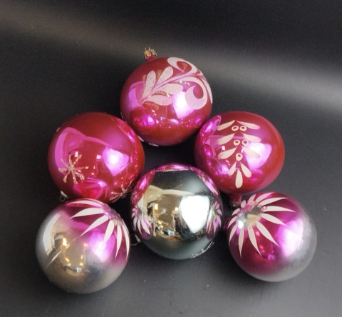 Ёлочные игрушки набор из 6 разных шариков, стекло, роспись, узоры, подвесные, винтаж СССР 1960-1990 гг