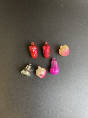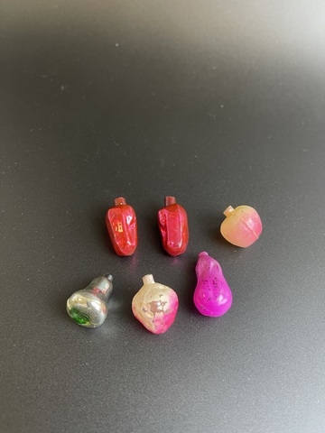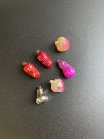 Ёлочные игрушки набор из 5 штук малютка на ёлку, груша, баклажан, 2 перца, клубника, яблоко, винтаж, стекло СССР 1950-1970 гг. Мини игрушки на маленькую ёлку. Высота игрушка от 3 см до 2 см. Состояние на фото, незначительные следы использования