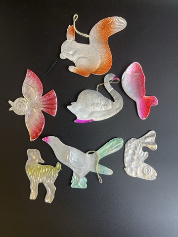 Ёлочные игрушки набор из 7 картонажных игрушек, белочка, 2 рыбки, птичка, кукушка, козлёнок, лебедь винтаж, СССР 1940-1960 гг.