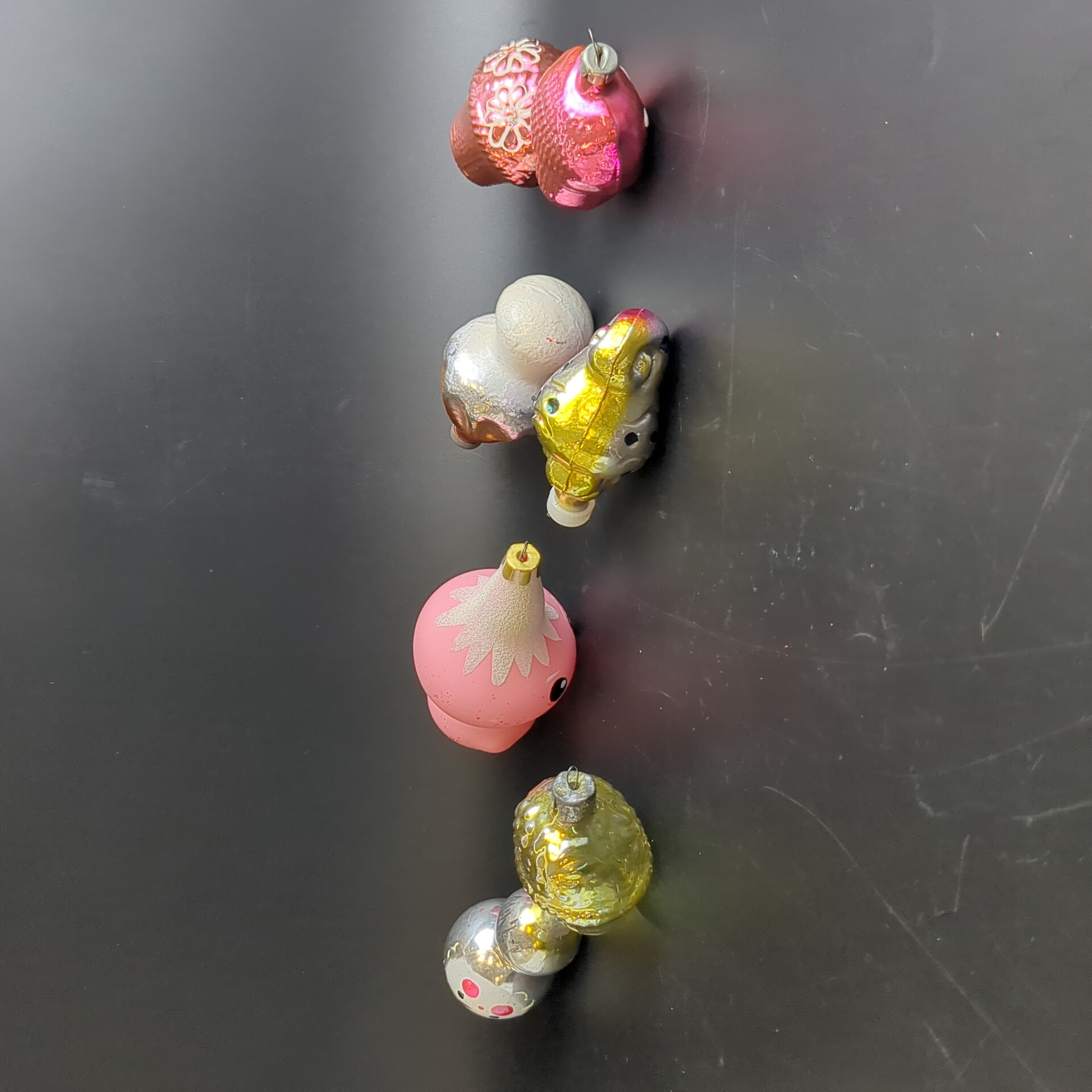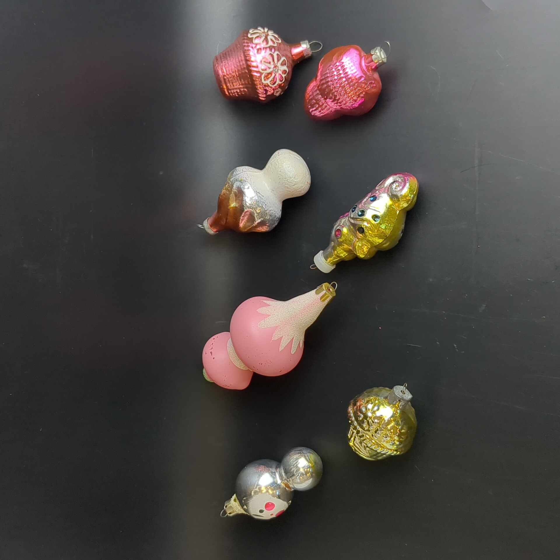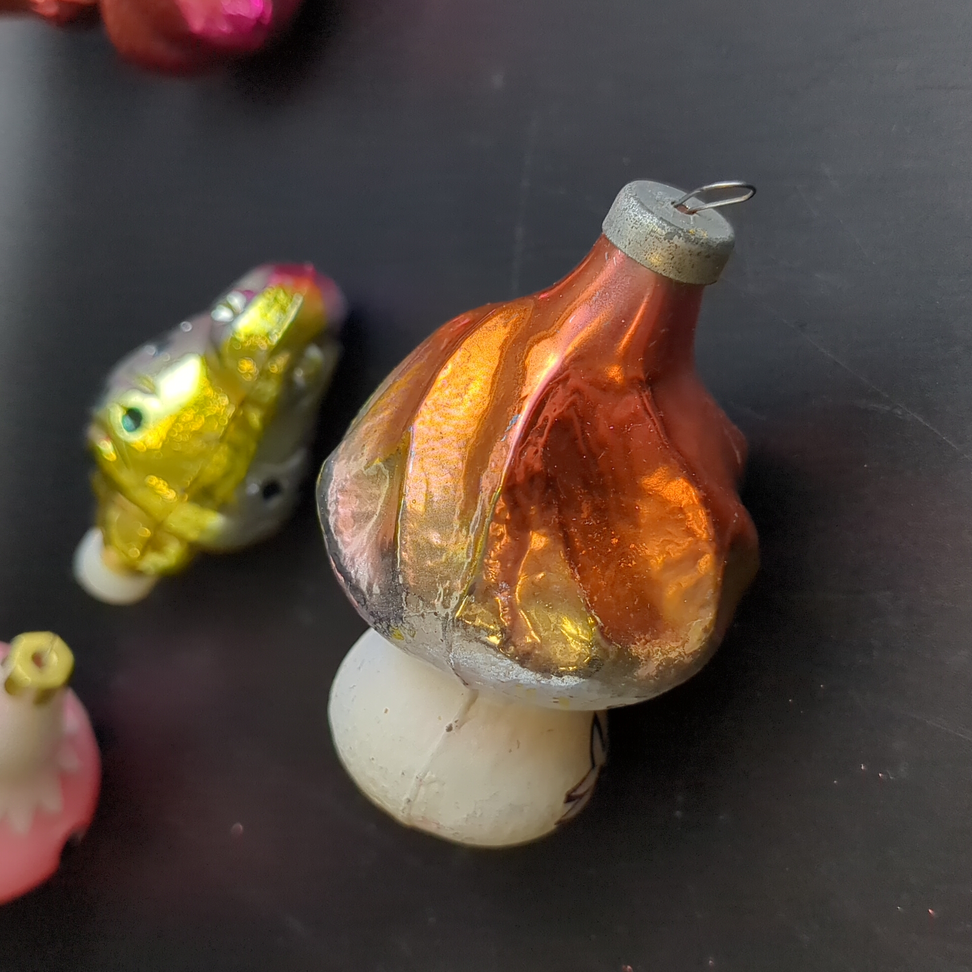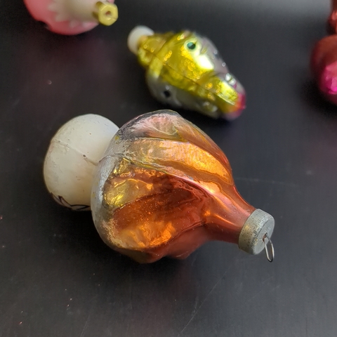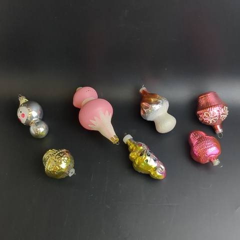 Ёлочные игрушки набор из 7 разных чипполино, морской конёк, гриб, филин и др, стекло, роспись, узоры, подвесные, винтаж СССР 1960-1990 гг