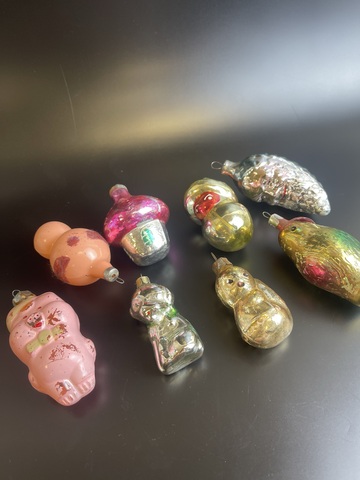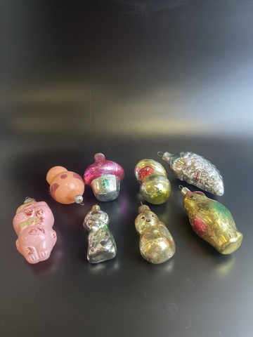 Ёлочные игрушки набор из 8 разных, домик, белочка, джин, шишка с лицом, попугай и др, стекло, винтаж СССР 1950-1980 гг. Присутствуют следы использования и сколы краях некоторых игрушек- состояние на фото
