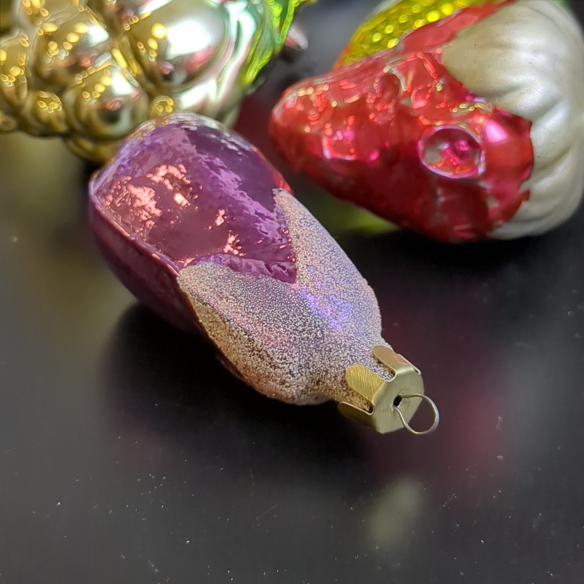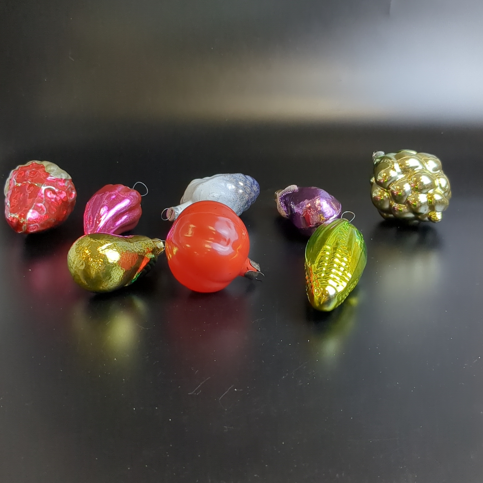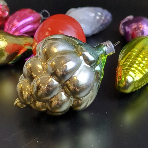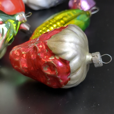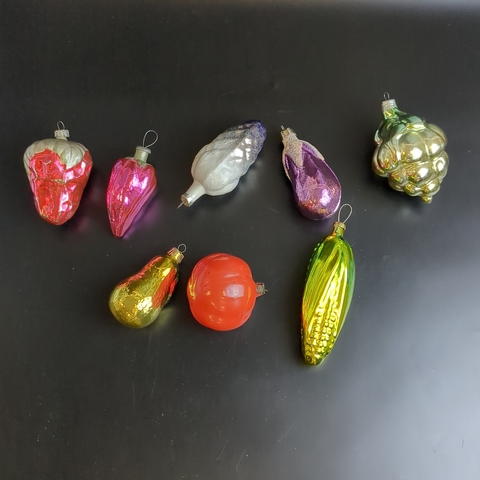 Ёлочные игрушки набор из 8 разных фруктов и овощей, кукуруза, баклажан, виноград, помидор и др, стекло, подвесные, винтаж СССР 1960-1980 гг