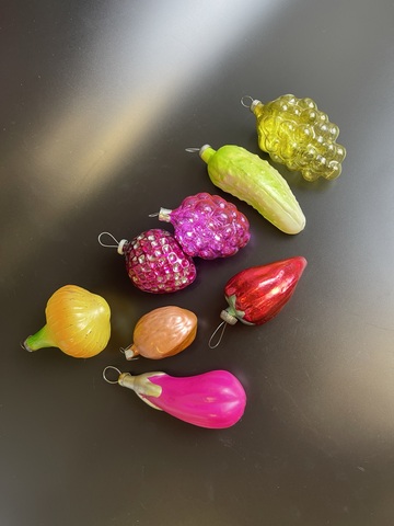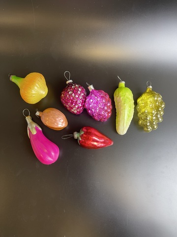 Ёлочные игрушки набор из 8 разных фруктов и овощей(баклажан/клубника/перец,2 винограда ,малина, лук, огурец ), стекло, винтаж СССР 1950-1980. Состояние и комплектация на фото