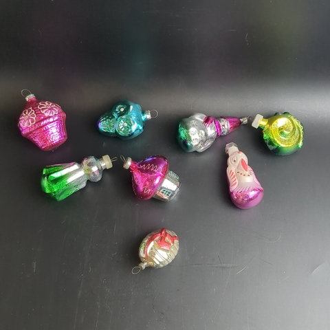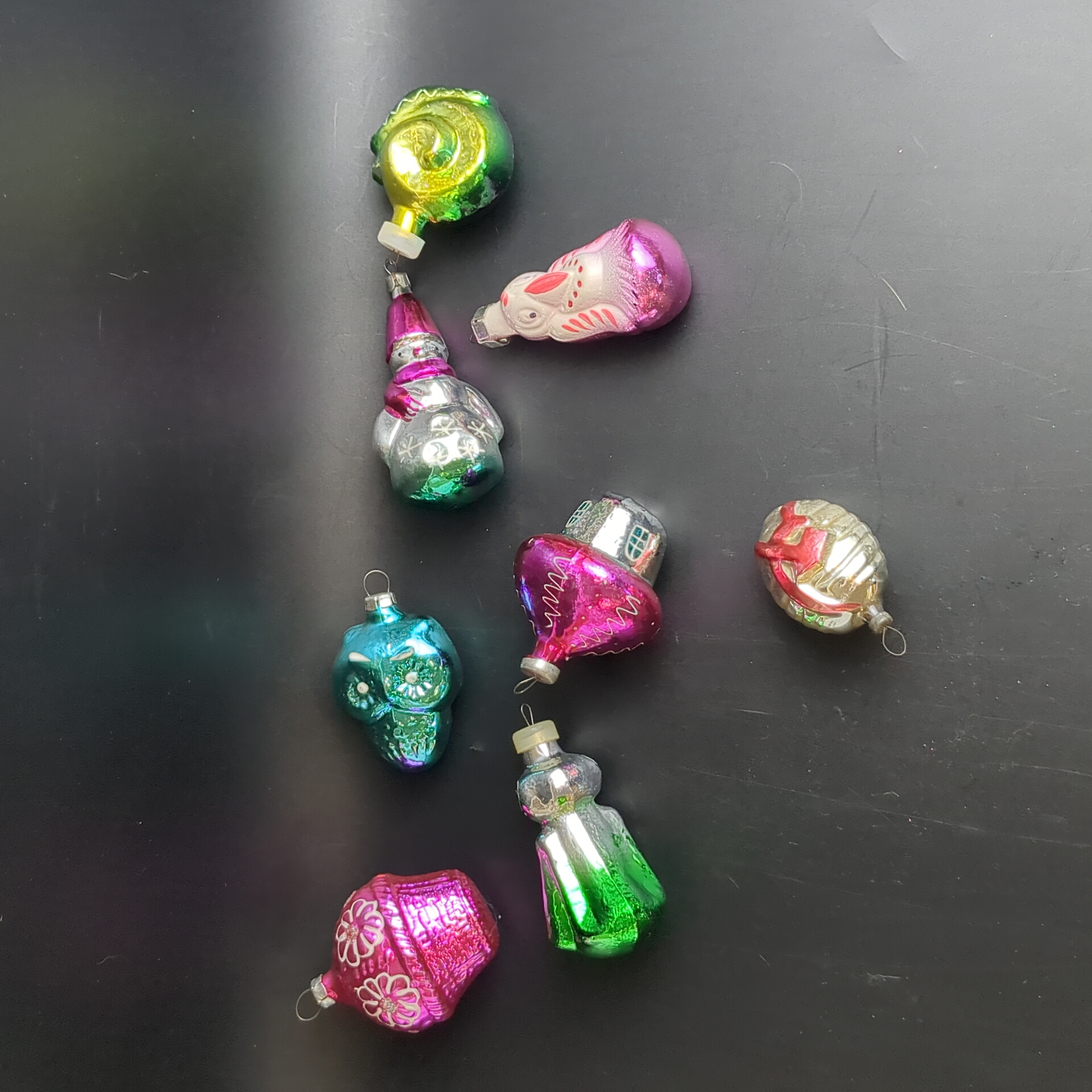 Ёлочные игрушки набор из 8 разных серп и молот медальон, снеговик, сова, кузнечик и др, стекло, роспись, узоры, подвесные, винтаж СССР 1960-1990 гг