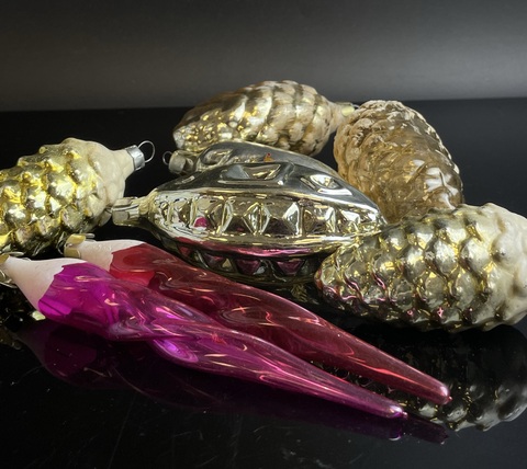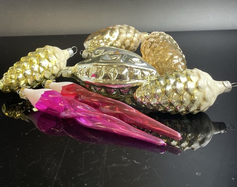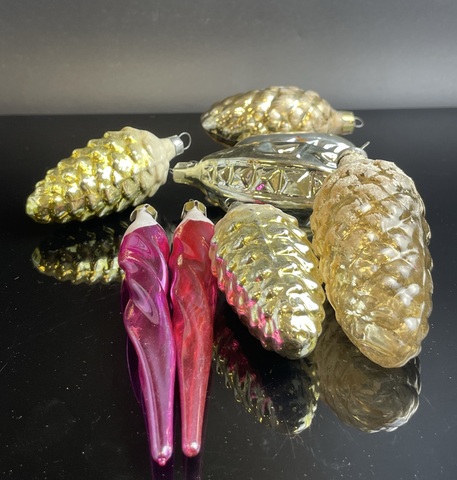 Ёлочные игрушки набор из 8 штук разные шишки и сосульки, стекло, подвесные, винтаж СССР 1960-1980 гг