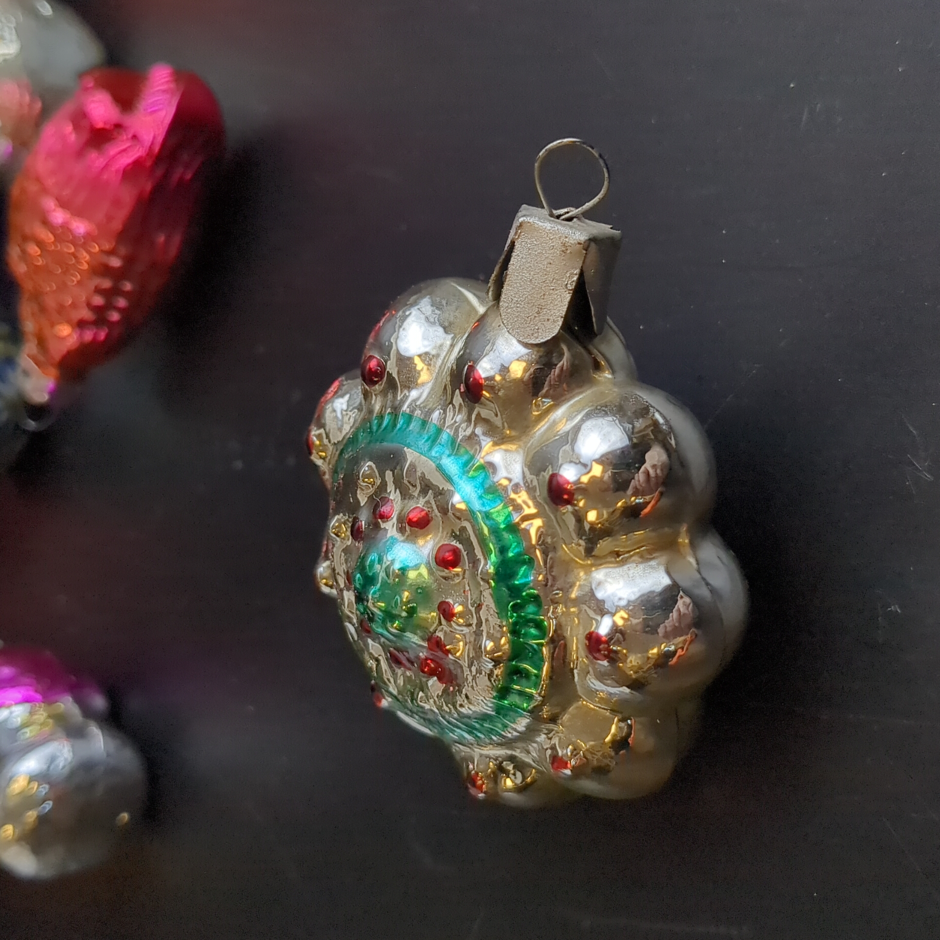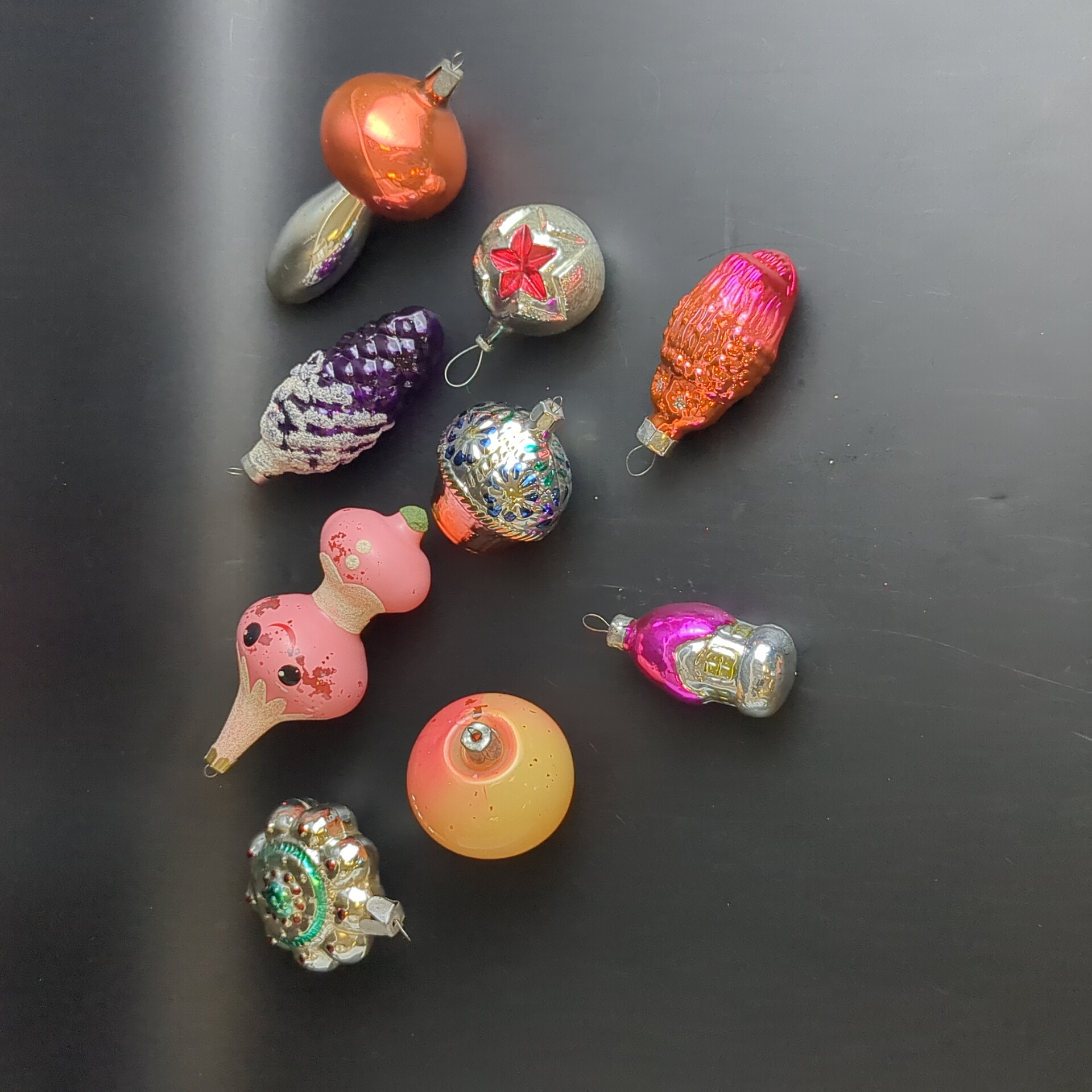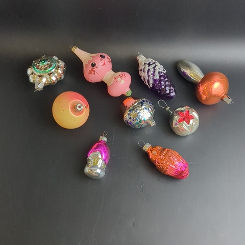 Ёлочные игрушки набор из 9 разных чипполино, медальон, звезда, шишка, кексик, домик и др, стекло, роспись, узоры, подвесные, винтаж СССР 1960-1990 гг