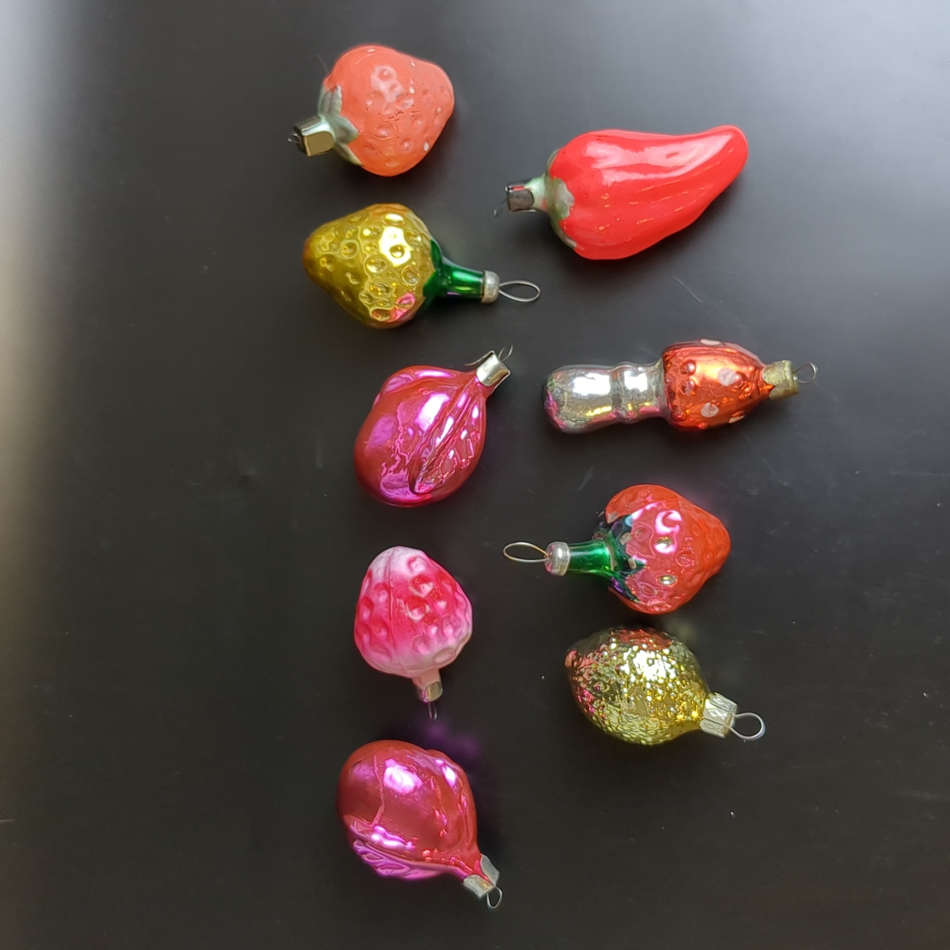 Ёлочные игрушки набор из 9 штук, лимон, гриб, клубника и др, стекло, подвесные, винтаж СССР 1960-1980 гг