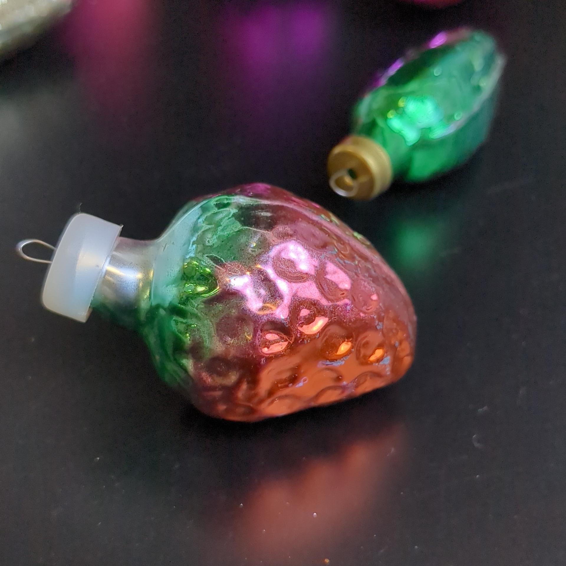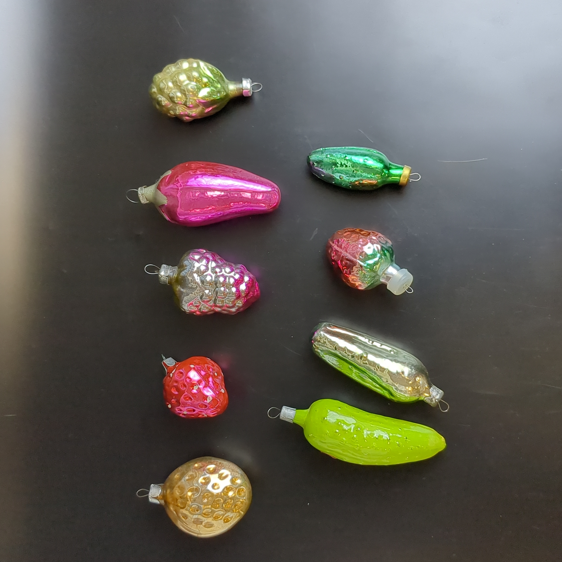 Ёлочные игрушки набор из 9 штук, огурцы,перец, клубника и др, стекло, подвесные, винтаж СССР 1960-1980 гг