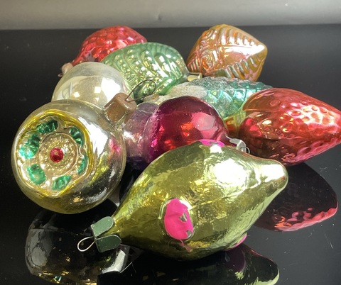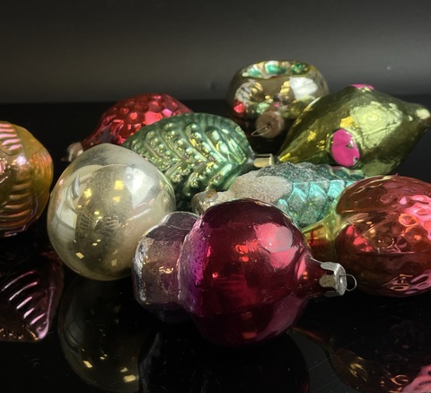 Ёлочные игрушки набор из 9 штук разных клубнички, грибок, шарики и др, стекло, подвесные, винтаж СССР 1960-1980 гг