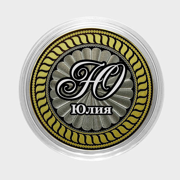 Сувенирная монета "Юлия" номиналом 10 рублей с выгравированным изображением.