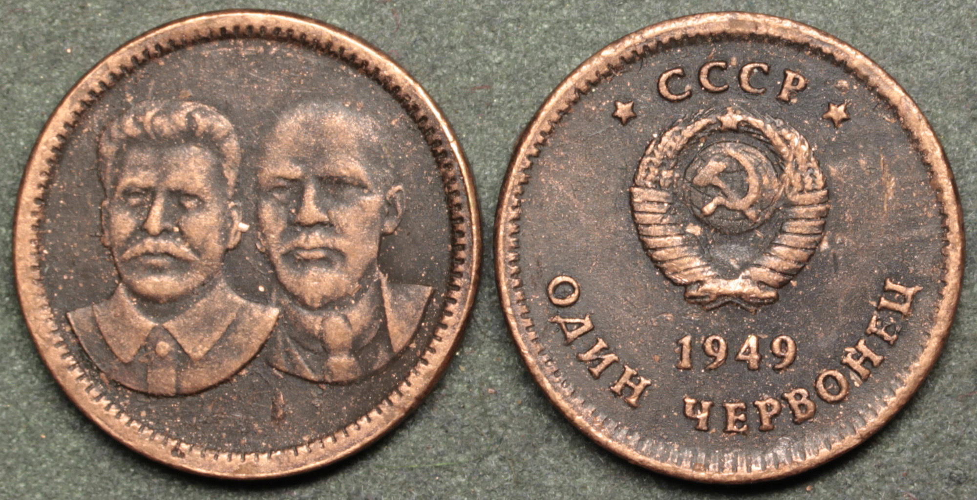 Жетон 1 червонец 1949 года Сталин Ленин полупрофиль 24 мм копия медь патина Копия