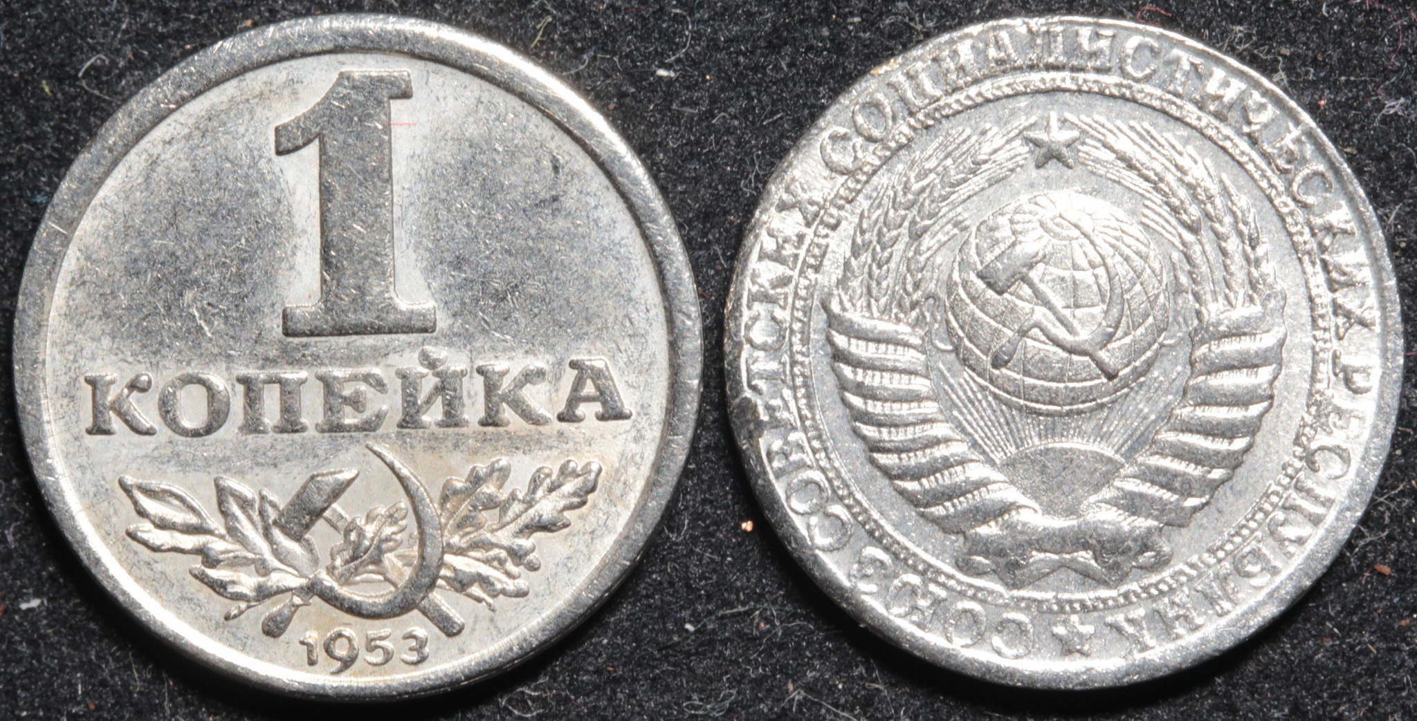Жетон 1 копейка 1953 года СССР Пробная Серп и молот Герб надпись по кругу копия никель Гурт гладкий Копия
