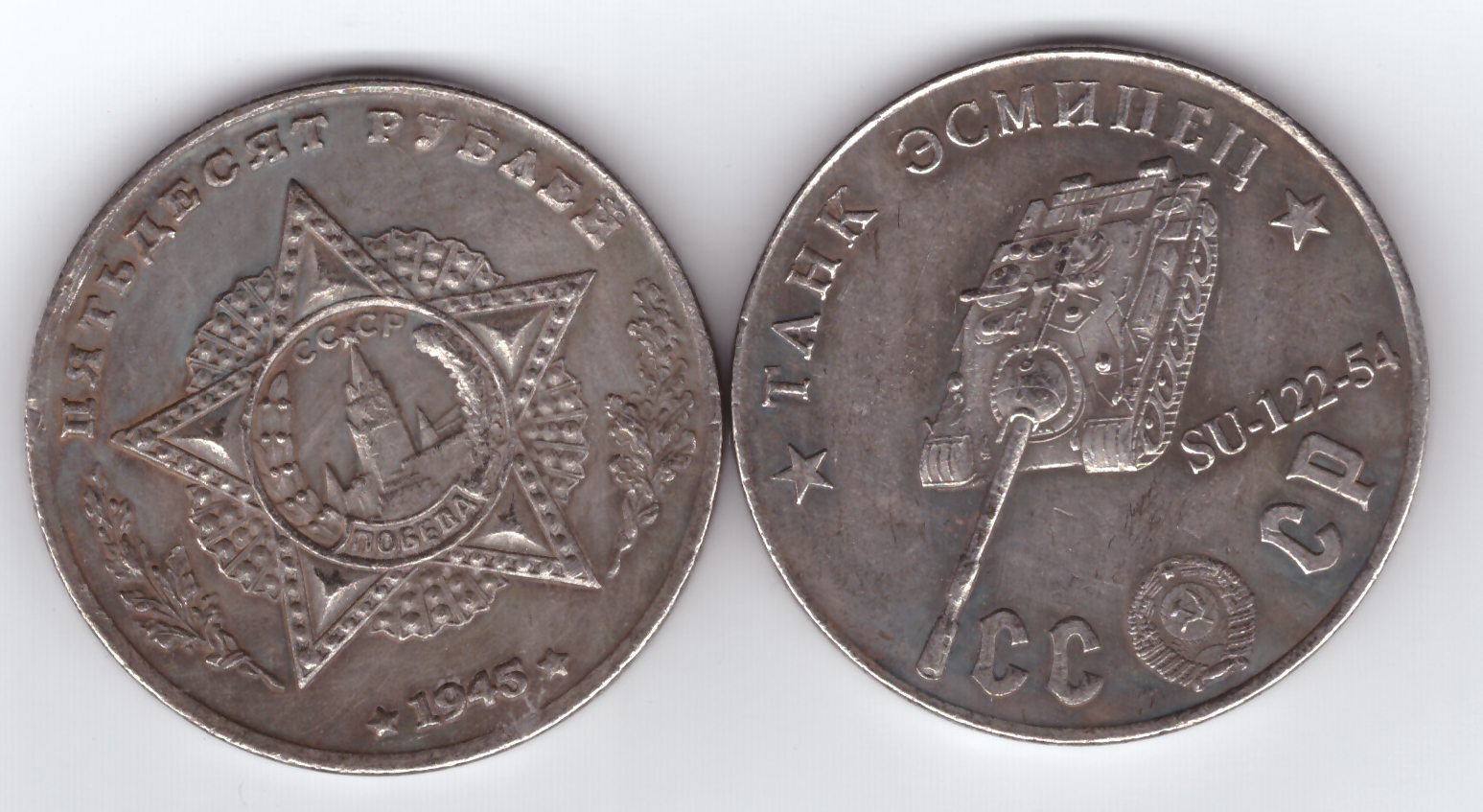 Жетон 50 рублей 1945 года СССР Танк Эсминец SU-122-54 посеребрение Копия
