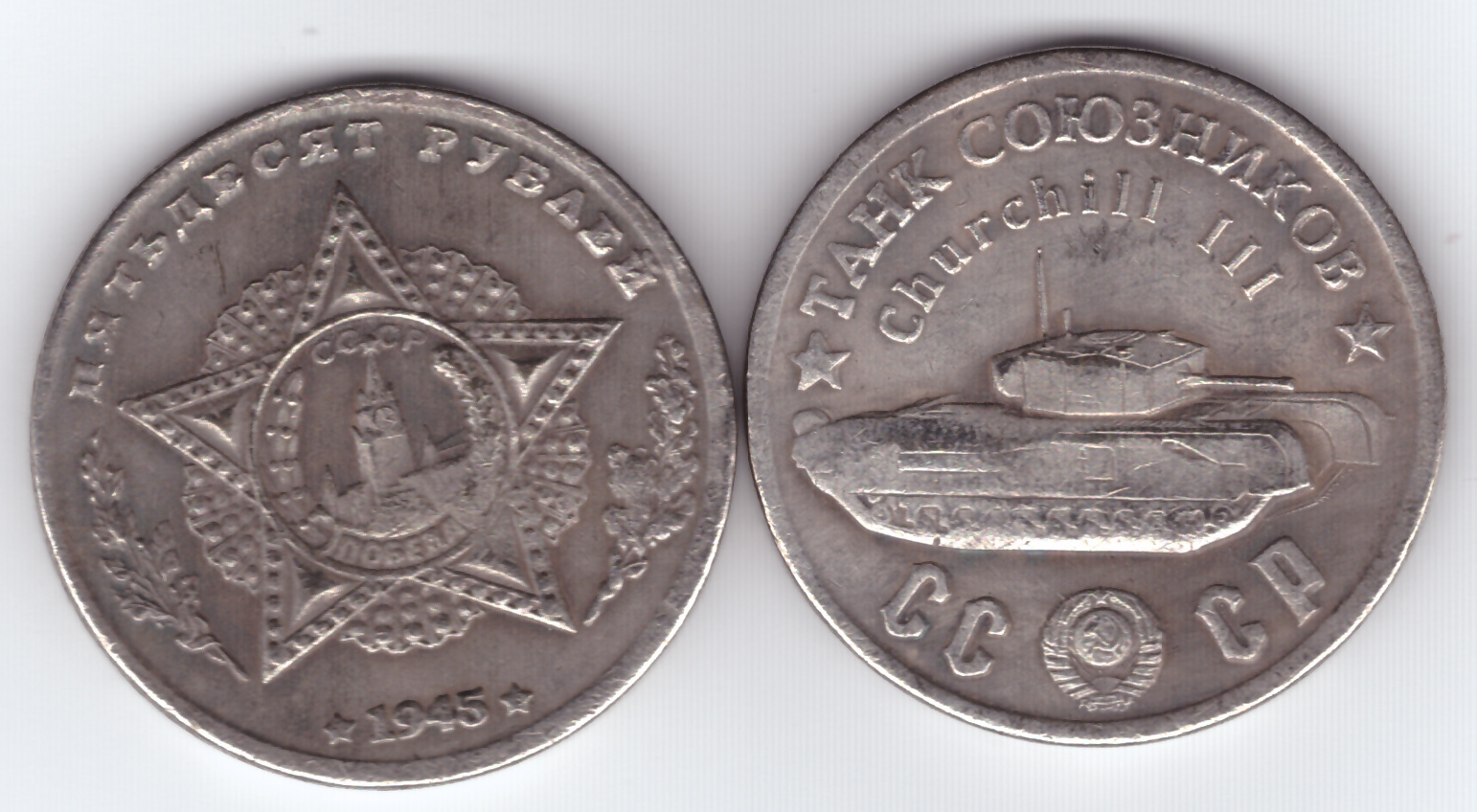 Жетон 50 рублей 1945 года СССР Танк союзников Churchill III посеребрение Копия