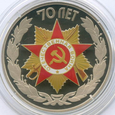 Жетон "70 лет Победы" 2015 год (серебряный). СПМД. Мельхиор 35 мм. Пруф с цветной термопечатью в капсуле