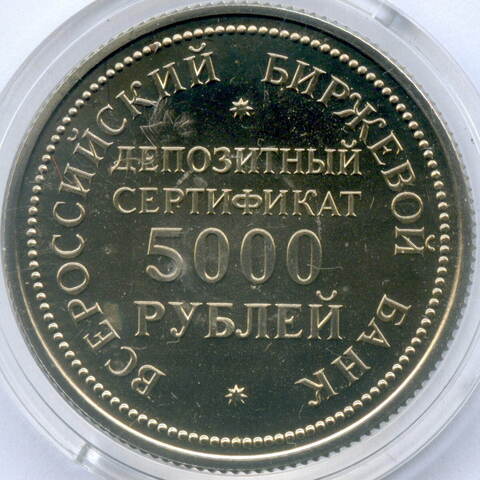 Жетон "Депозитный сертификат 5000 рублей" 1991 год. Всероссийский Биржевой банк. 32 мм