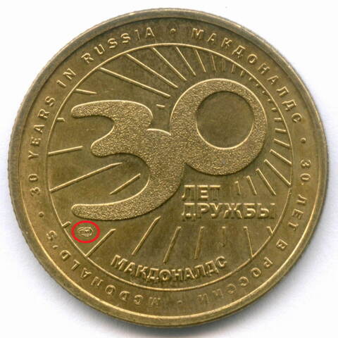 Жетон Макдоналдс "30 лет дружбы - Вот что я люблю" 2020 год. СПМД. Латунь 28 мм XF-AU