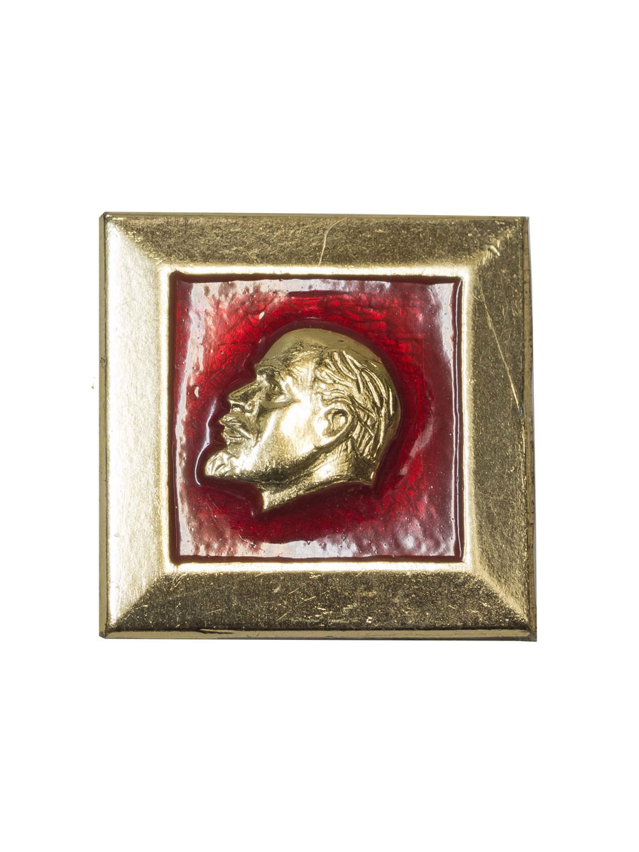 Значок квадратной формы с изображением на красном фоне выпуклого левого профиля В.И. Ленина (золотистого цвета), с широким золотистым кантом. Застежка-булавка.