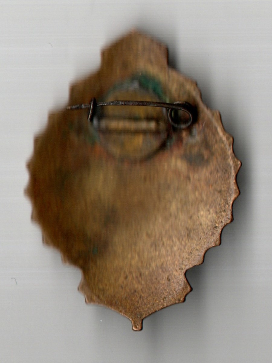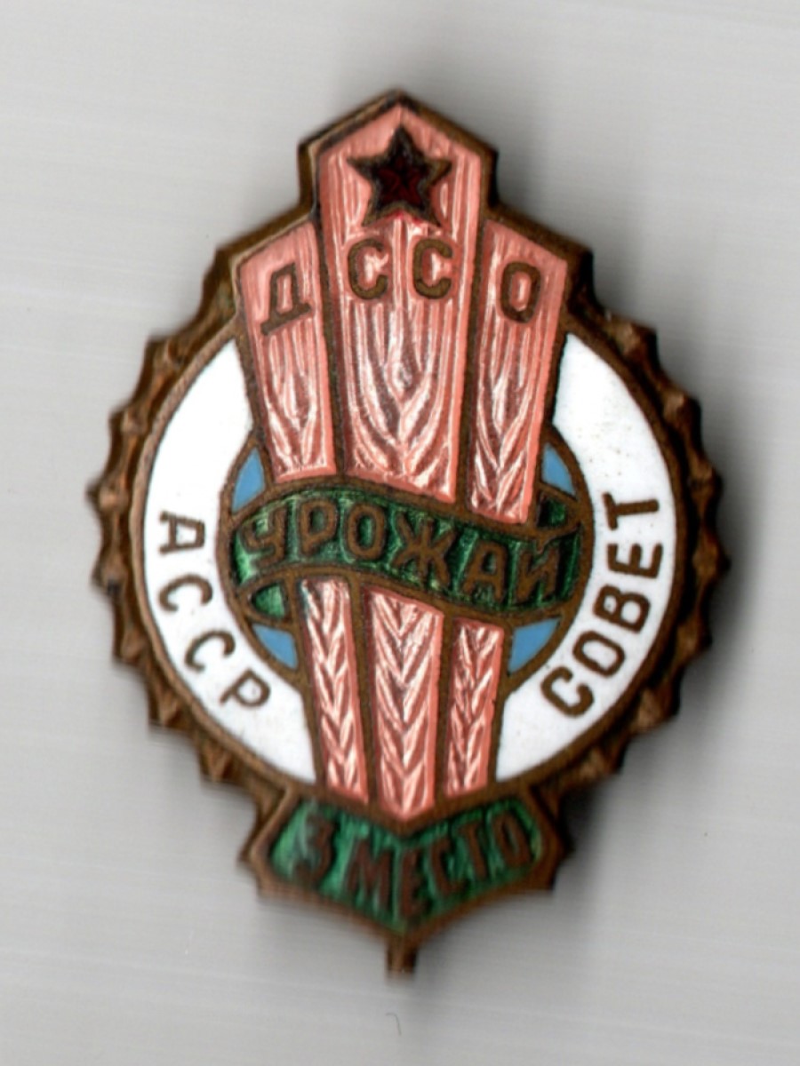 Знак 3-е место первенства ДССО (добровольного сельского спортивного объединения) "Урожай", латунь, эмаль, булавка, 1950-1970-е гг.